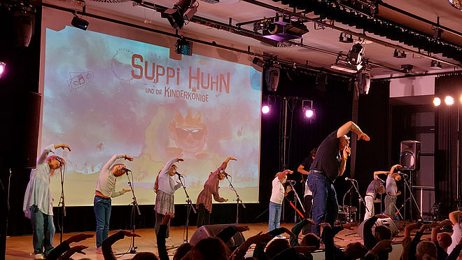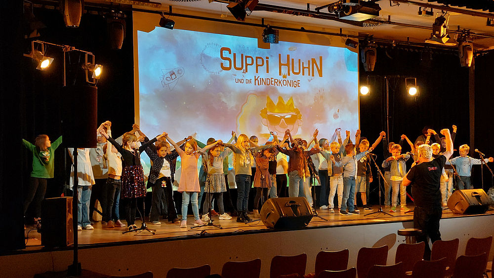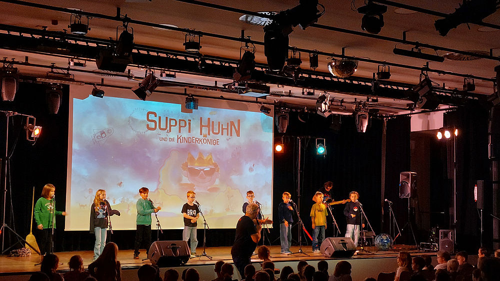 Die Aula der Gesamtschule Saarn war voll besetzt. Suppi lieferte mit den Kindern der Klostermarktschule die perfekte Bühnenshow. Der Eingangsfilm nahm Kinder und Eltern auf eine Weltraumreise mit. Danach sangen alle Schülerinnen und Schüler gemeinsam mit Suppi 8 Songs plus Zugaben. Jede Jahrgangsstufe hatte 8 Bühnenkinder ausgewählt, die während der Songs auf der Bühne die Refrains gesungen haben.